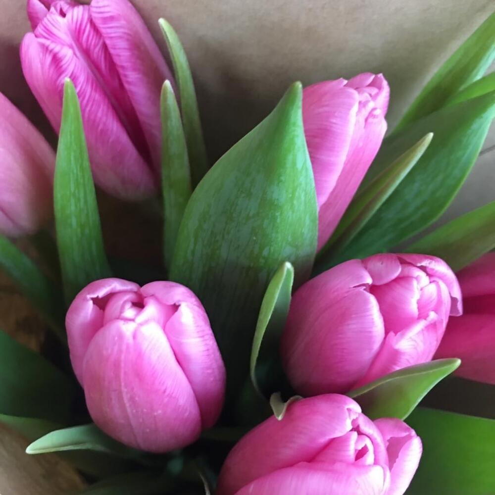 Моно букет из 7 розовых тюльпанов в крафтовой упаковке. Размер букета 15*40 см.