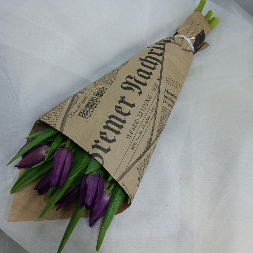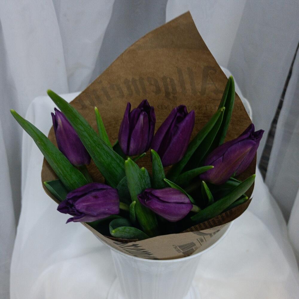Моно букет из 7 фиолетовых тюльпанов в крафтовой упаковке. Размер букета 15*40 см.