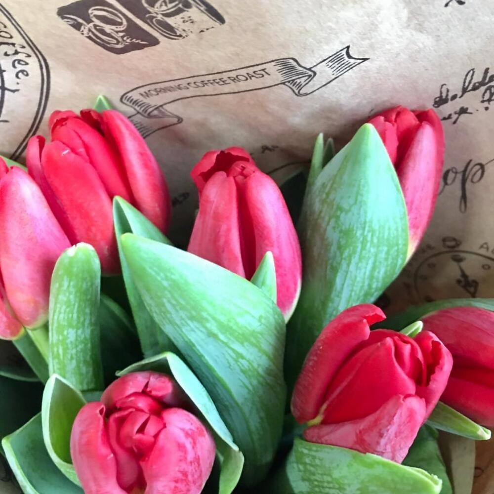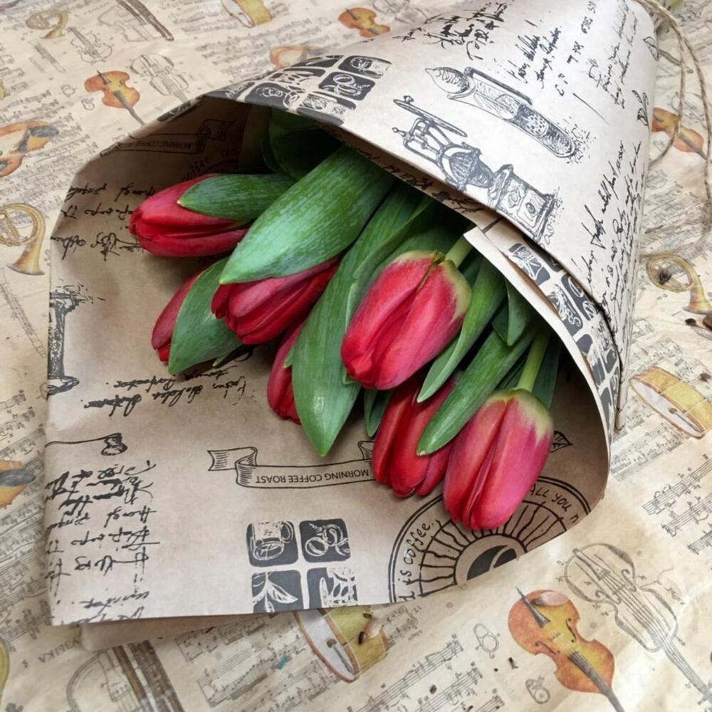 Моно букет из 7 красных тюльпанов в крафтовой упаковке. Размер букета 15*40 см.