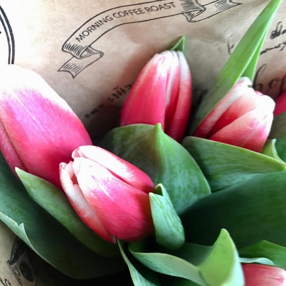 Моно букет из 7 красно-белых тюльпанов в крафтовой упаковке. Размер букета 15*40 см.