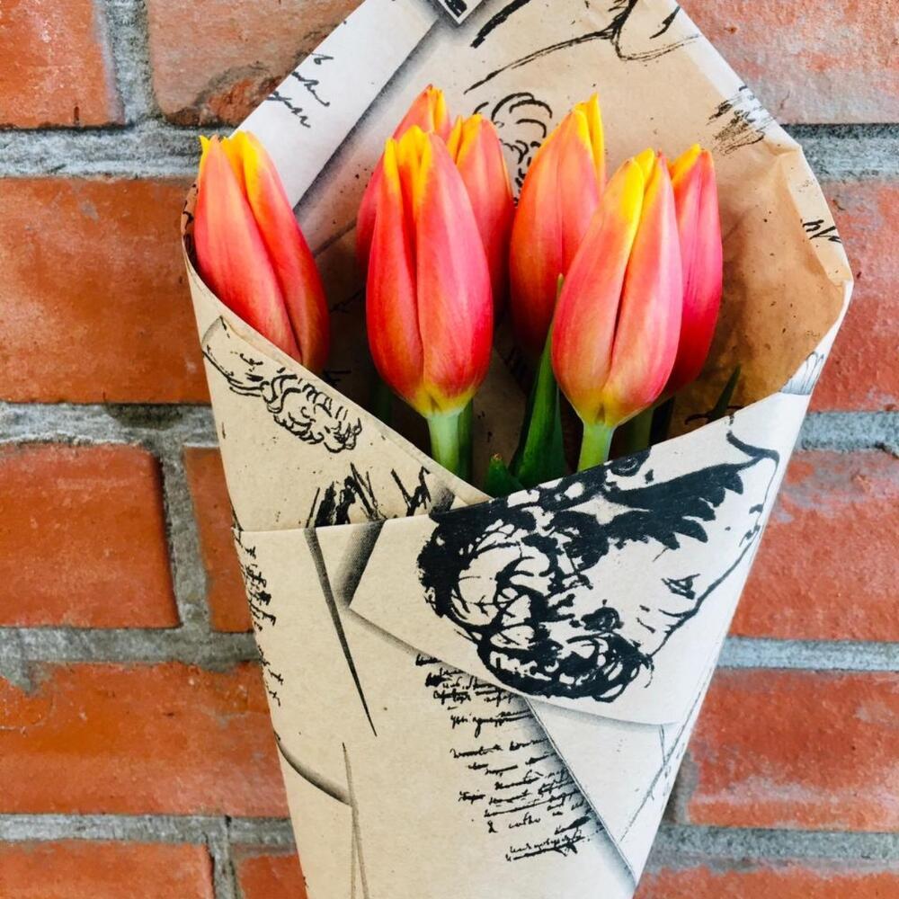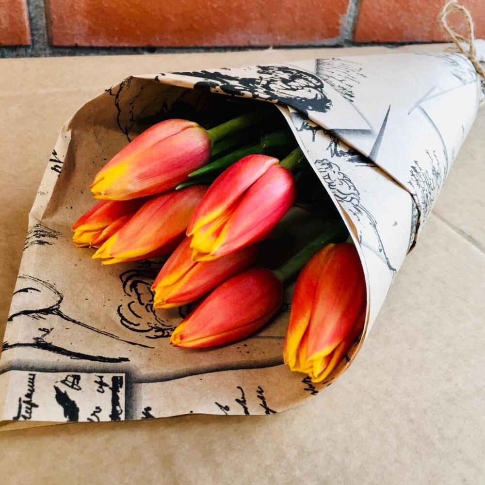 Моно букет из 7 красно-жёлтых тюльпанов в крафтовой упаковке. Размер букета 15*40 см.