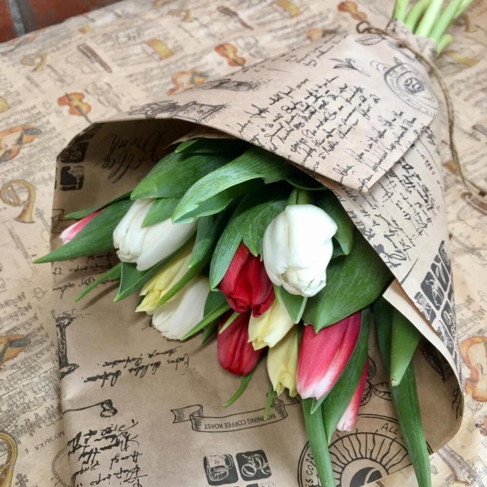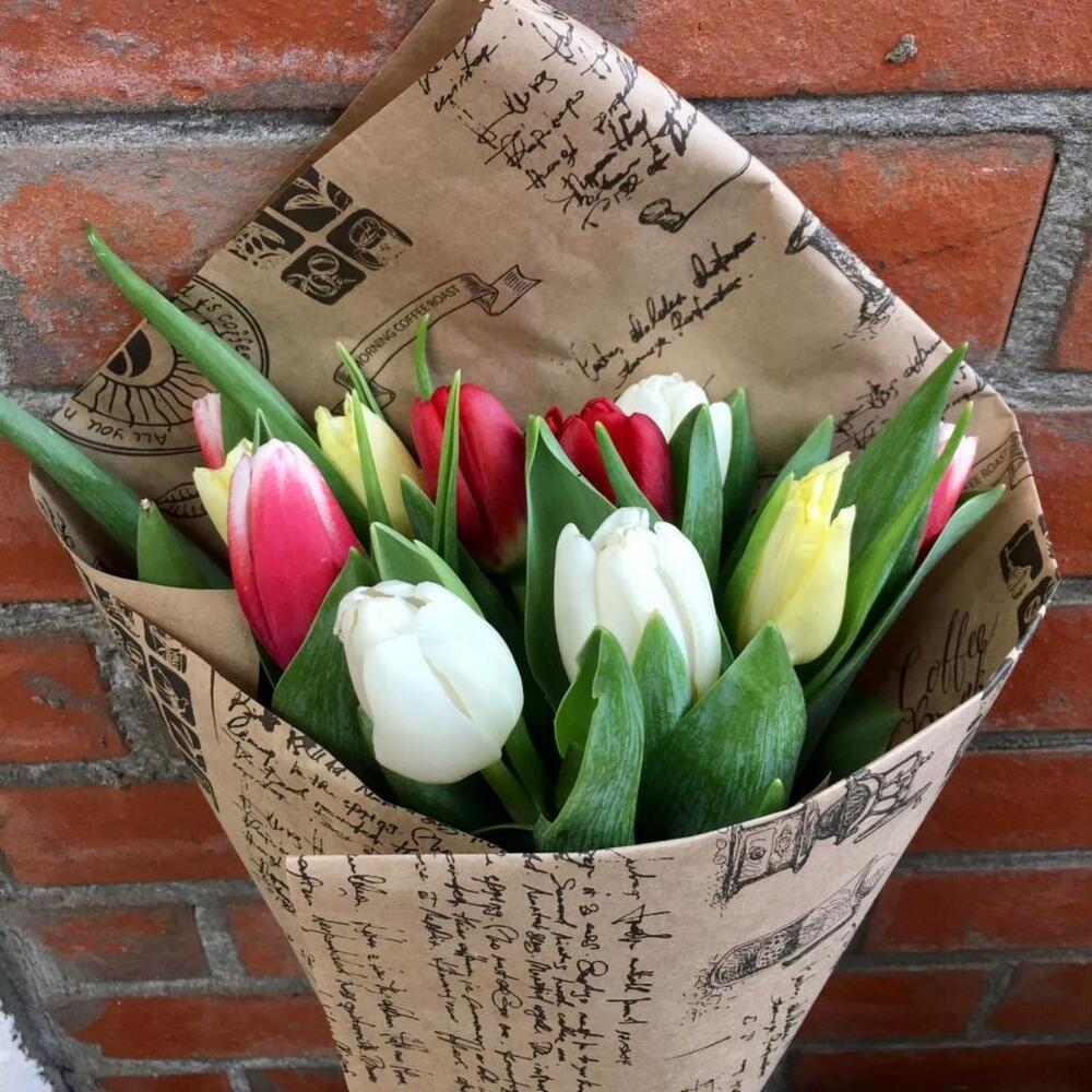 11 тюльпанов разного цвета (минимум три цвета)в крафтовой упаковке. Размер букета 15*40 см. Букет собирается из тюльпанов по наличию в магазине, точной копии фото не будет, готовы обсудить детали и пожелания по телефону, указанному на главной странице сайта.