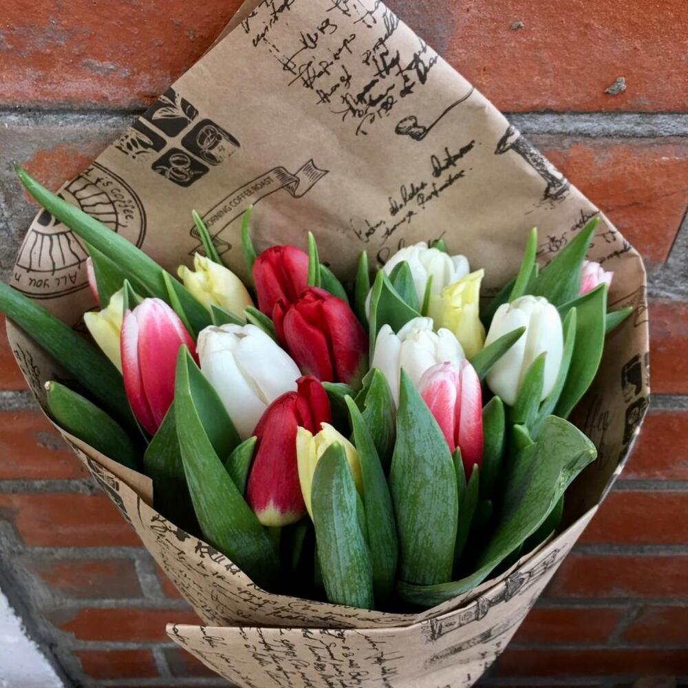 15 тюльпанов разного цвета (минимум три цвета)в крафтовой упаковке. Размер букета 20*40 см. Букет собирается из тюльпанов по наличию в магазине, точной копии фото не будет, готовы обсудить детали и пожелания по телефону, указанному на главной странице сайта.