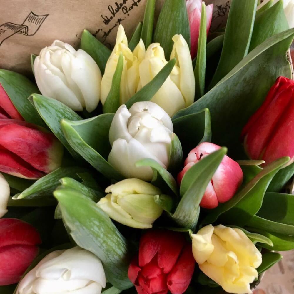 25 тюльпанов разного цвета (минимум три цвета)в крафтовой упаковке. Размер букета 30*40 см. Букет собирается из тюльпанов по наличию в магазине, точной копии фото не будет, готовы обсудить детали и пожелания по телефону, указанному на главной странице сайта.