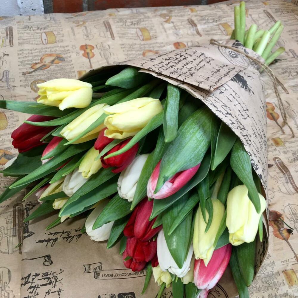 25 тюльпанов разного цвета (минимум три цвета)в крафтовой упаковке. Размер букета 30*40 см. Букет собирается из тюльпанов по наличию в магазине, точной копии фото не будет, готовы обсудить детали и пожелания по телефону, указанному на главной странице сайта.